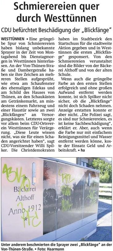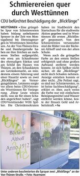 | 11:11, 2. Aug. 2012 | 20120802 WA Schmierereien Blickfaenge Westtuennen.jpg (Datei) | 102 KB | {{Bild-WA |Motiv=Artikel |Redakteur=Haarmann |Fotograf=Haarmann |VÖ=02.08.2012}} Kategorie:Pressebericht | 1 | |