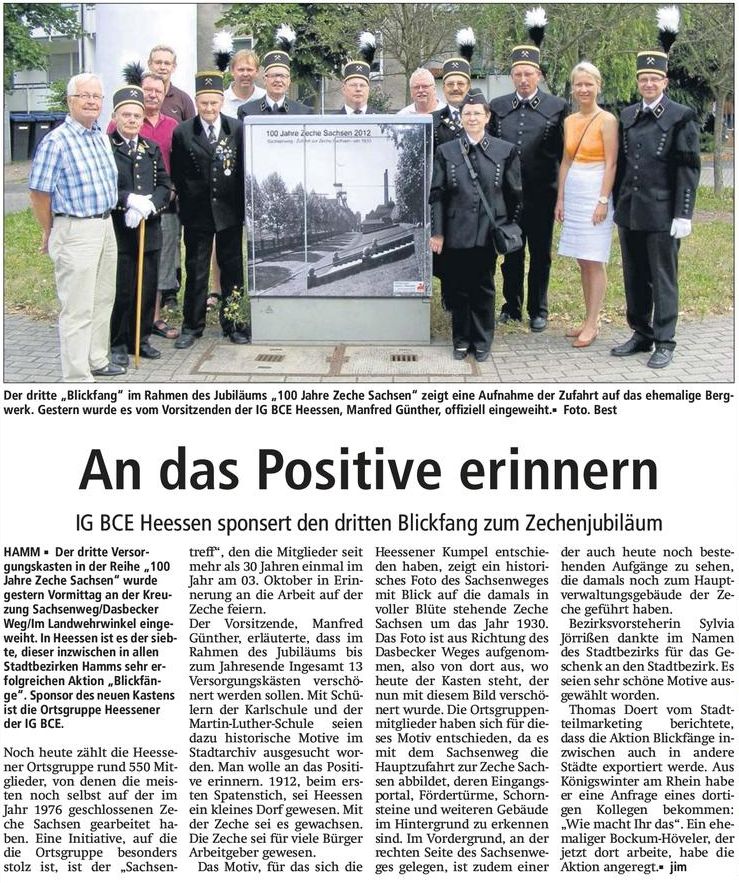 | 09:14, 23. Aug. 2012 | Blickfang HE007.jpg (Datei) | 421 KB | {{Bild-CC |Motiv="100 Jahre Zeche Sachsen 2012", Sachwenweg Zufahrt zur Zeche Sachsen um 1930, historische Aufnahme<br>Standort: Dasbecker Weg / Ecke Im Landwehrwinkel |Fotograf=Thomas Neuhaus |Aufnahmedatum=22.08.2012 |Quelle= |Urheber=Thoma | 1 | |