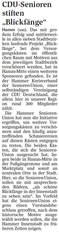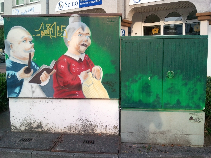 | 09:16, 23. Aug. 2012 | Blickfang MI901.jpg (Datei) | 408 KB | {{Bild-CC |Motiv=Zeichnung Seniorenpaar<br>Standort: Antonistraße / Ecke Widumstraße |Fotograf=Thomas Neuhaus |Aufnahmedatum=22.08.2012 |Quelle= |Urheber=Thomas Neuhaus |Freigabe=ab Einstellung für HammWiki }} | 1 | |