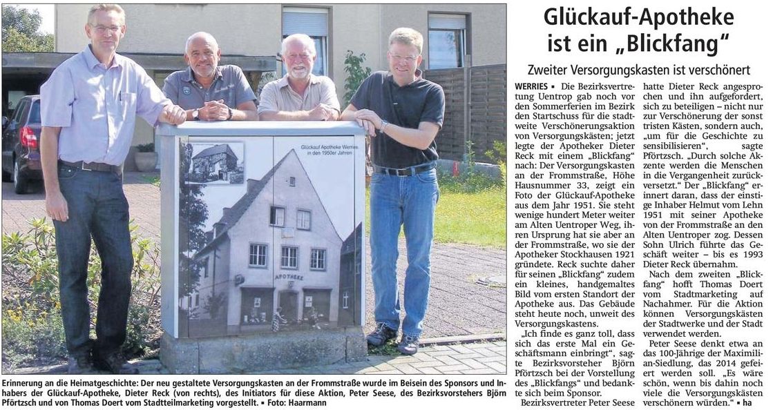 | 09:28, 19. Jul. 2012 | 20120719 WA Blickfaenge Kamener Strasse 120.jpg (Datei) | 151 KB | {{Bild-WA |Motiv=Artikel |Redakteur=gri |Fotograf=Rother |VÖ=19.07.2012}} Kategorie:Pressebericht | 1 | |