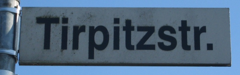 | 19:14, 29. Sep. 2012 | Strassenschild Tirpitzstrasse.jpg (Datei) | 49 KB | {{Bild-CC |Motiv=Straßenschild |Fotograf=Thomas Neuhaus |Aufnahmedatum=16.09.2012 |Urheber=Thomas Neuhaus |Freigabe=ab Veröffentlichung für HammWiki }} | 1 | |