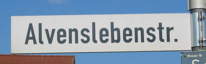| 19:41, 29. Sep. 2012 | Strassenschild Alvenslebenstrasse.jpg (Datei) | 53 KB | {{Bild-CC |Motiv=Straßenschild |Fotograf=Thomas Neuhaus |Aufnahmedatum=16.09.2012 |Urheber=Thomas Neuhaus |Freigabe=ab Veröffentlichung für HammWiki }} Kategorie:Straßenschilder | 1 | |