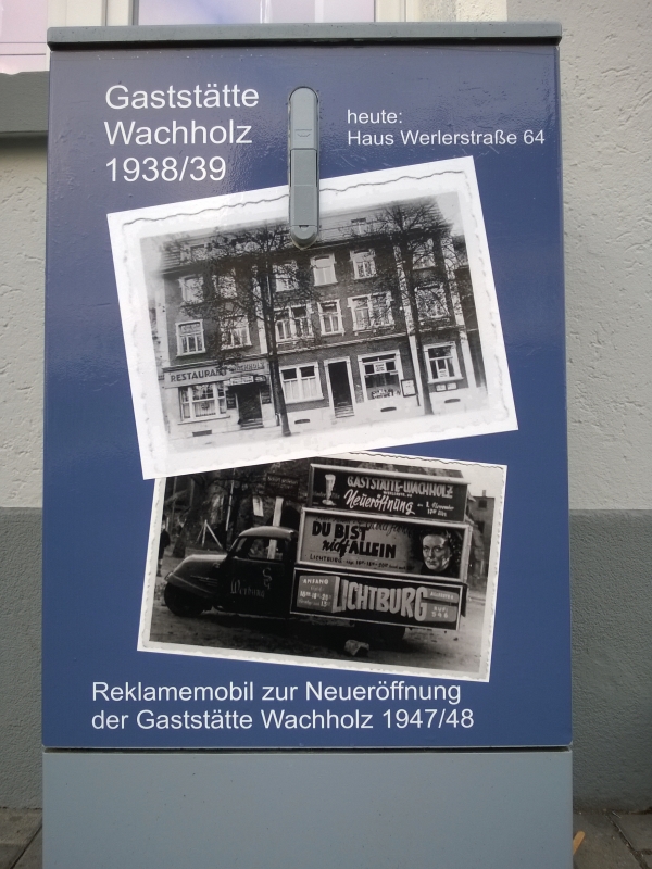 | 17:54, 21. Mär. 2014 | Blickfang MI018.jpg (Datei) | 369 KB | {{Bild-CC |Motiv=Blickfang MI018<br>Motiv:''Gaststätte Wachholz 1938/39'' und ''Reklamemobil zur Neueröffnung der Gaststätte Wachholz 1947/48'', historische Aufnahmen<br> Standort: Werler Straße, Hausnummer 64 |Fotograf=Thomas Neuhaus |Aufnahmedat | 1 | |