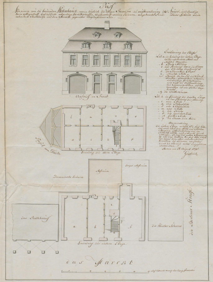 Landesarchiv NRW Abteilung Westfalen W 051 Karten A Allgemein Nr 20463 Hamm (Hamm) Haus am Markt (Entwurf) Ansicht, Grundrisse Riss von einem neu zu bauenden Wohnhause, worin zugleich die nötigen Remisen zu Aufbewahrung der Feuer und sonstigen beim Magistrat befindliche notwendige Gerätschaften aufbewahret werden können 1795 50 köln. Fuß = 12,6 cm 48 x 35 kol. Zeichnung Gosebruch Kriegs- und Domänenkammer Hamm Nr. 1068