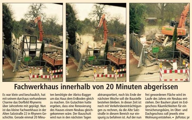 | aktuell | 12:50, 16. Feb. 2015 | 729 × 456 (101 KB) | MyRegioGuide (Diskussion | Beiträge) | {{Bild-WA |Motiv=Fachwerkhaus innerhalb von 20 Minuten abgerissen |Redakteur=jb |Fotograf=privat |Aufnahmedatum= |VÖ=24. Januar 2015 |Leserbrief= }} Kategorie:Pressebericht |