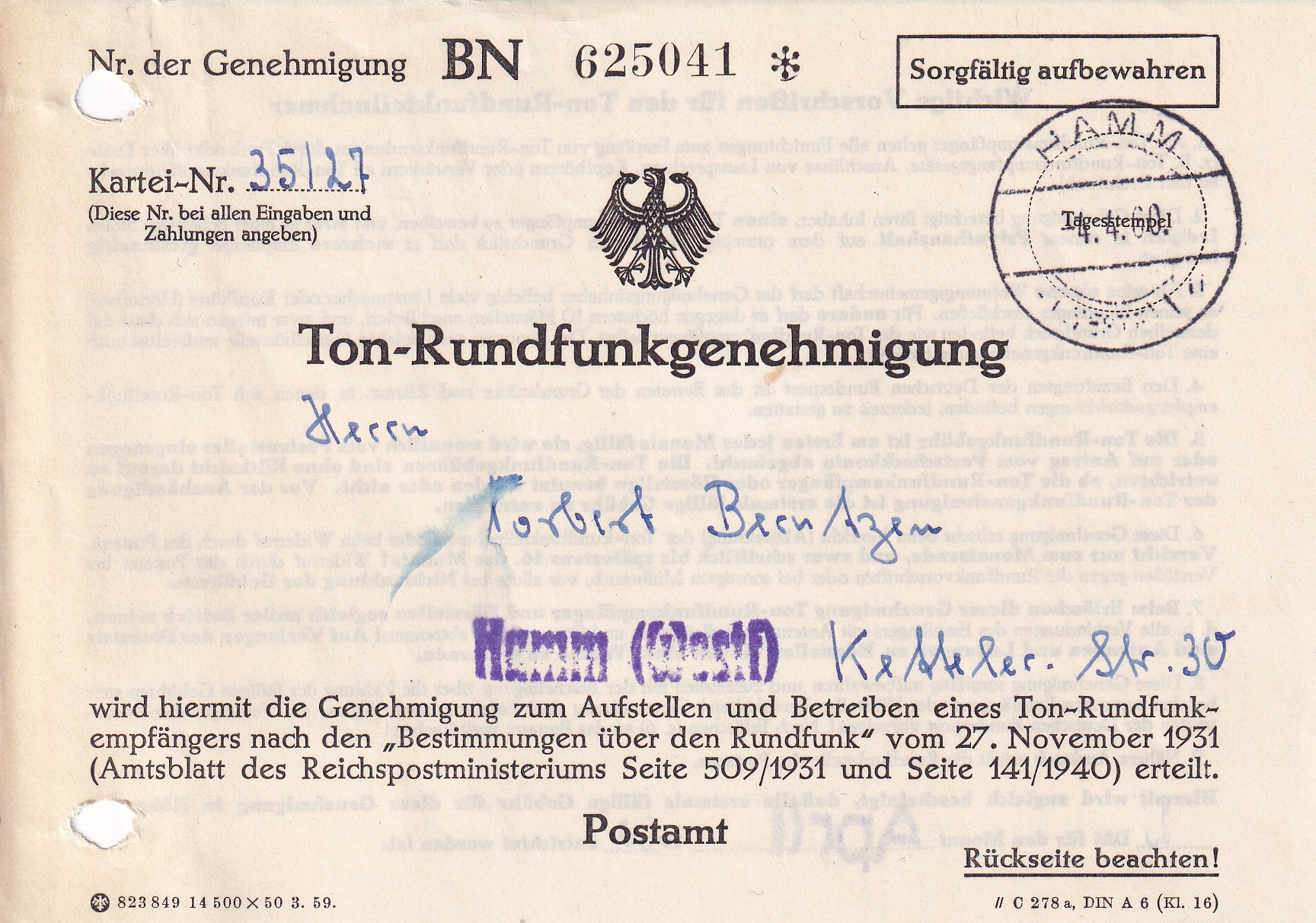 Ton-Rundfunkgenehmigung - ausgestellt vom Postamt Hamm 1960 Scan: Dr. Detlef Berntzen