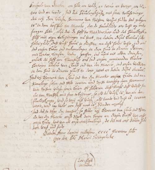 Und zum Zeugnis der Wahrheit haben wir, Gerhard von Kleve und von der Mark, unser Siegel an diesen Brief hängen lassen, für uns, unsere Erben und alle unsere Nachkommen, die dies mit uns fest und stetig halten sollen.